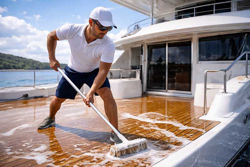 Trash removal, deck scrub (above rail), rinse, and chamois dry.